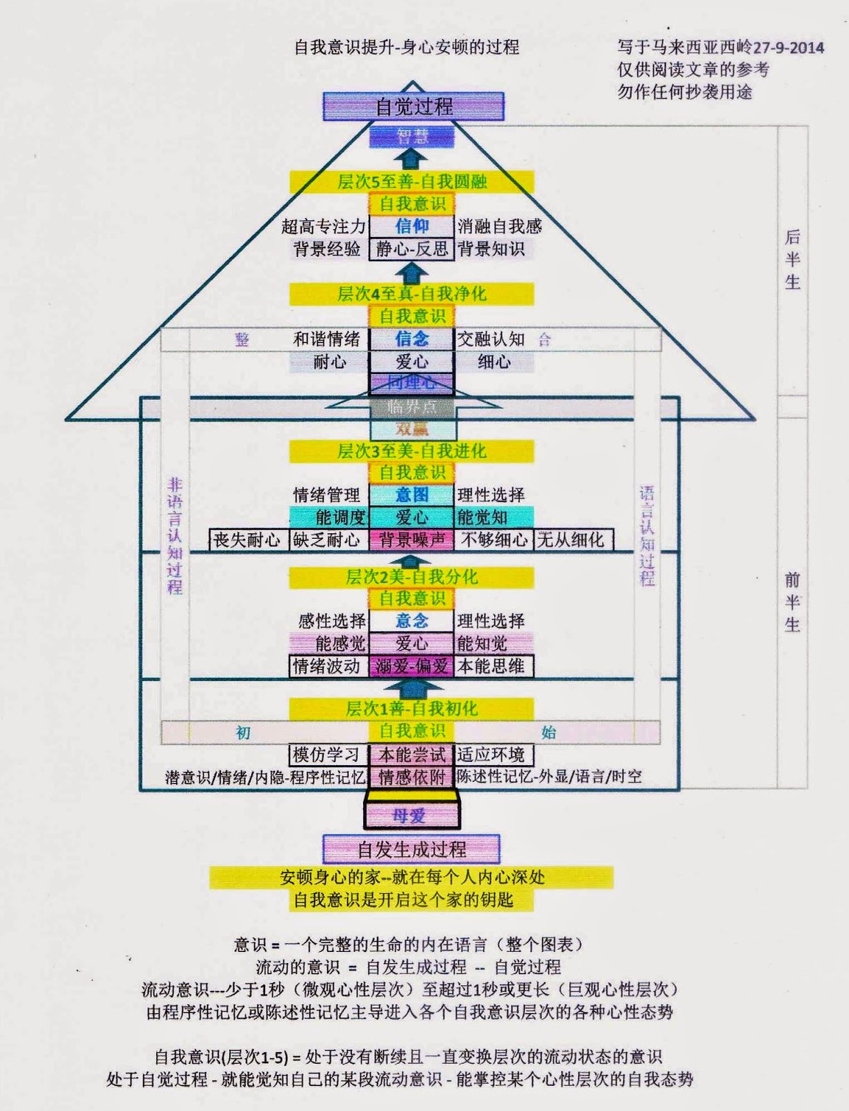 反思——上述种种历程的时而含混,时而厘清的心路; 上述种种历程的层次处于运作的规律,时而局部,时而整体,并以此心路和规律作共时连接性的生命高层次话语的反映,表述一个生命完整性的话语。